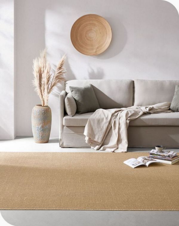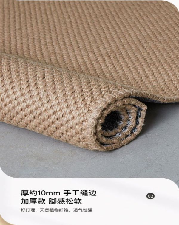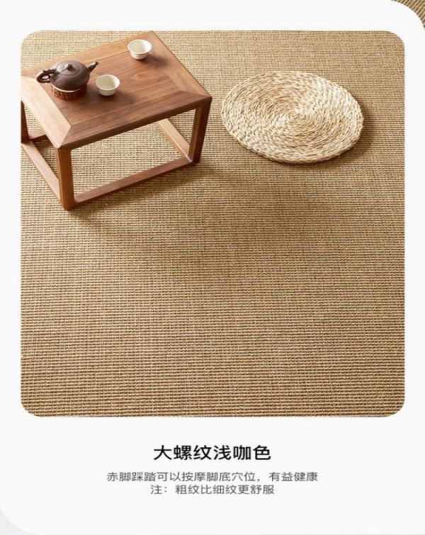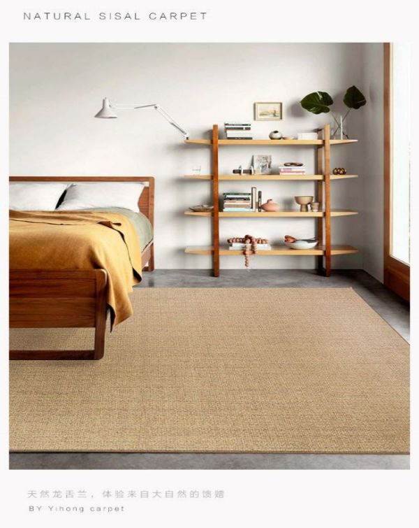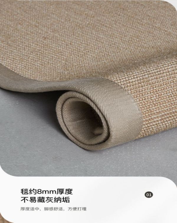 剑麻地毯是一种新型地毯,采用天然剑麻纤维编织而成,比较符合现代人对清新自然的追求。剑麻地毯一般有斜纹,鱼骨纹,帆布平纹,多米诺纹等多种花色。剑麻地毯绿色环保,价格较羊毛、真丝地毯实惠,而且具有抗压、耐磨、耐酸碱、吴静电等优点